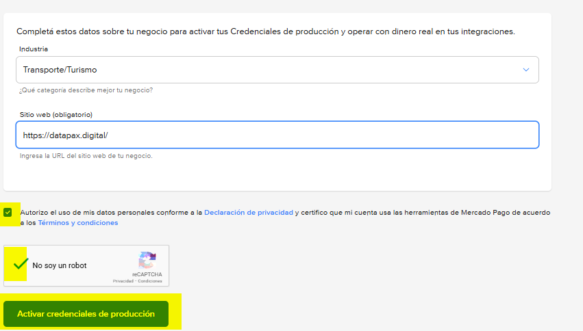 En esa sección completaremos la industria o actividad comercial de la empresa en este caso Transporte / Turismo, y colocar nuestro sitio web, y luego autorizaremos y validaremos para Activar las credenciales.