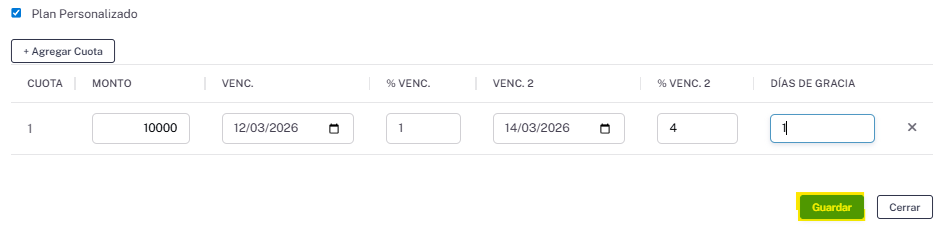 • Días de gracia: Cantidad de días adicionales permitidos sin recargo.