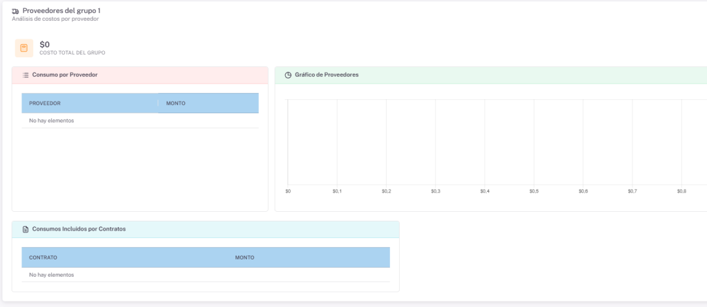 Te muestra todo lo relacionado con los gastos, pagos, consumos, contratos y costos vinculados a los proveedores. Aquí puedes verificar rápidamente qué facturas de proveedores están pagadas y cuáles siguen pendientes.